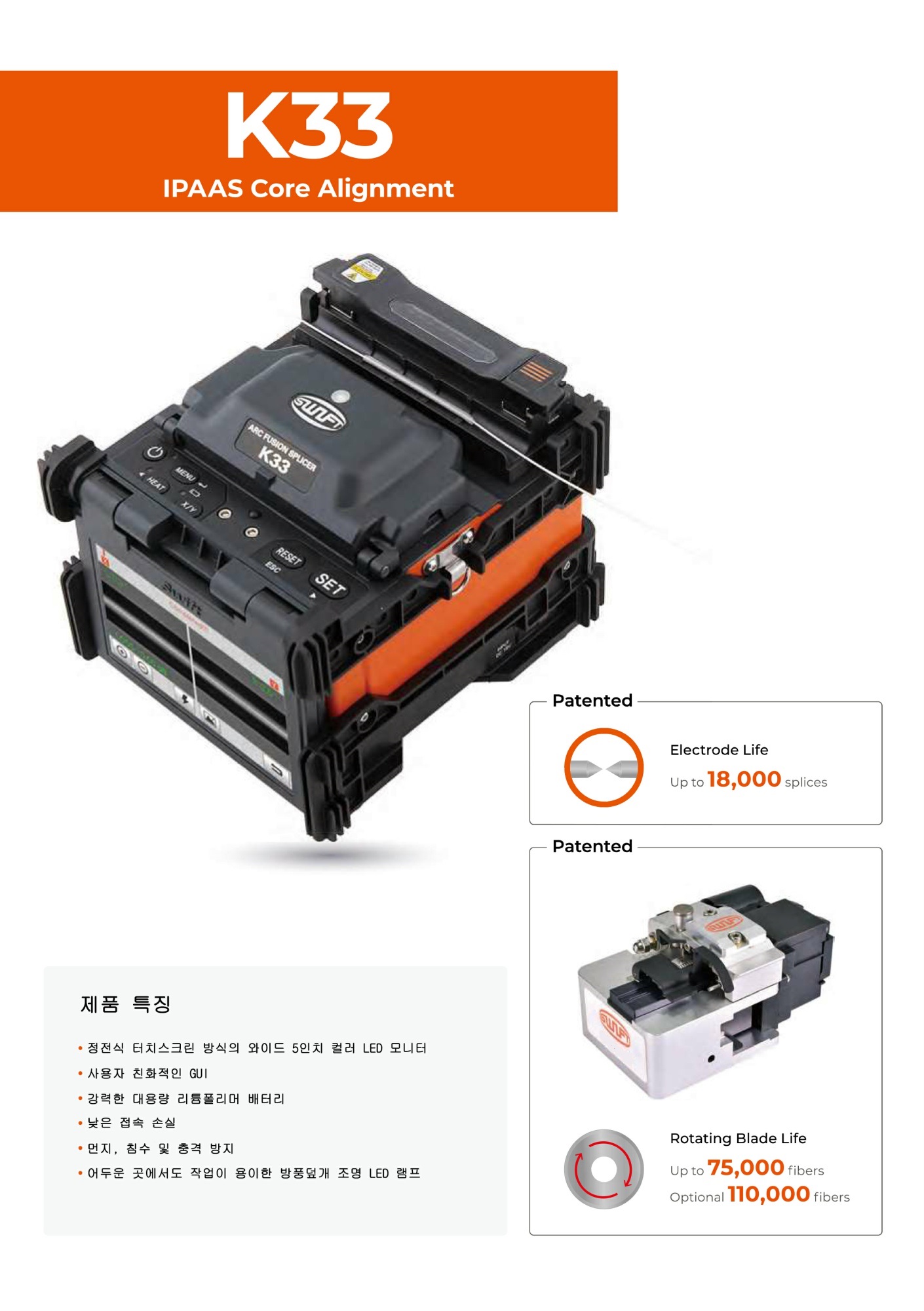 Swift K33은 중거리 및 장거리 광 네트워크, CATV 네트워크 및 FTTx 네트워크를 위한 고도로 발전되고 정확한 IPAAS 코어 대 코어 정렬 융착 접속기입니다. 작고 가벼우며 견고한 디자인과 긴 수명의 배터리를 사용하여 고정밀 성능을 제공합니다. 또한, 터치스크린이 있는 5인치 모니터는 사용자에게보다 편리하고 효율적인 작업성을 제공합니다.