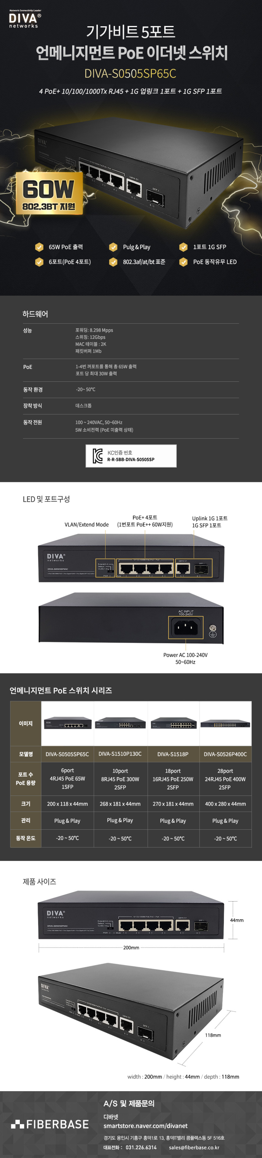 FB정보통신 DIVA-S0505SP65C 기가비트 5포트 이더넷 스위치허브 PoE 65W