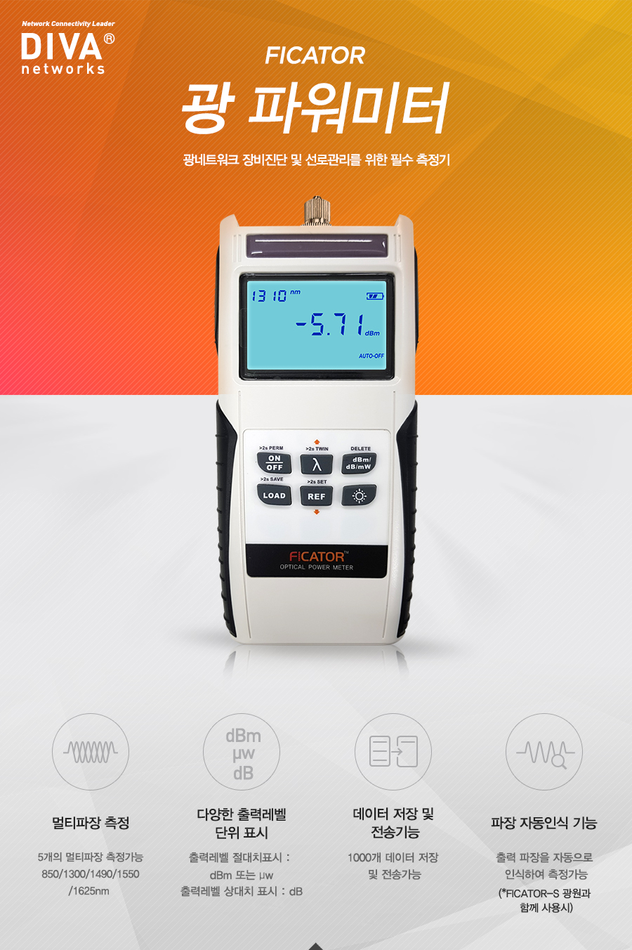 ● 광 네트워크 장비진단 및 선로관리를 위한 필수 측정기 ● 멀티파장 측정 ● 다양한 출력레벨 단위 표시 ● 데이터 저장 및 전송기능 ● 파장 자동인식 기능