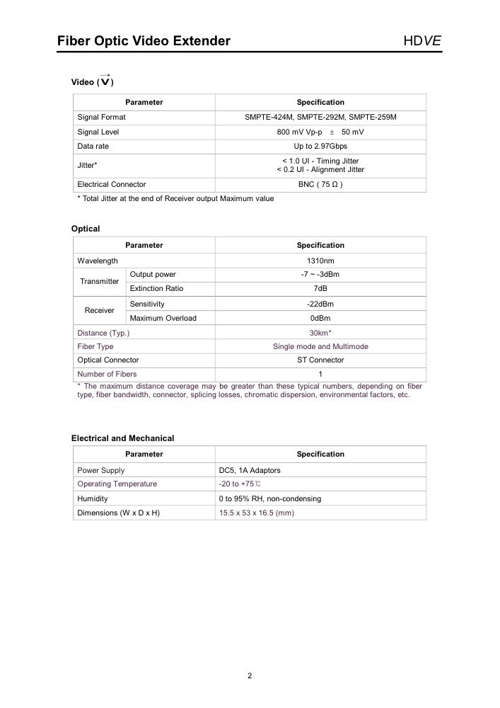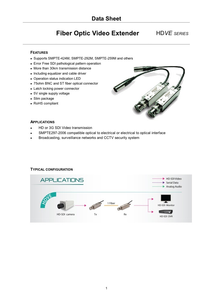HDVE (HD-SDI Video Extender) series는 소형의 HD-SDI 디지털 비디오 광전송 모듈로, 송신기(Tx: HDVE-Tx)와 수신기(Rx: HDVE-Rx)로 분리되어 있으며, 송신 지역과 수신 지역까지 SDI 신호를 광섬유 연결을 통해 최소의 손실로 전송 할 수 있습니다. 송신기(HDVE-Tx)는 전기적 SDI 신호를 입력 받고 424M/292M/259M SDI 신호를 광 데이터로 변환하며, 반대로 수신기(HDVE-Rx)는 광섬유를 통해 광 데이터를 수신하고 424M/292M/259M SDI신호를 전기적 SDI 데이터로 변환합니다.