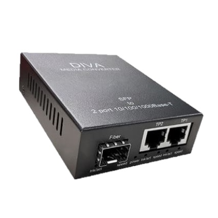 DIVA-ME2 모델은 이더넷 신호를 광 신호로 변환하는 미디어 컨버터 제품으로서 2개의 RJ45 포트와 1개의 SFP 포트를 통해 기가비트 고속 통신을 지원합니다. 2개의 RJ45 포트와 1개의 SFP 광 포트 사이에 스위칭 기능을 제공하기 때문에 다양한 이더넷 네트워크를 구성할 수 있습니다