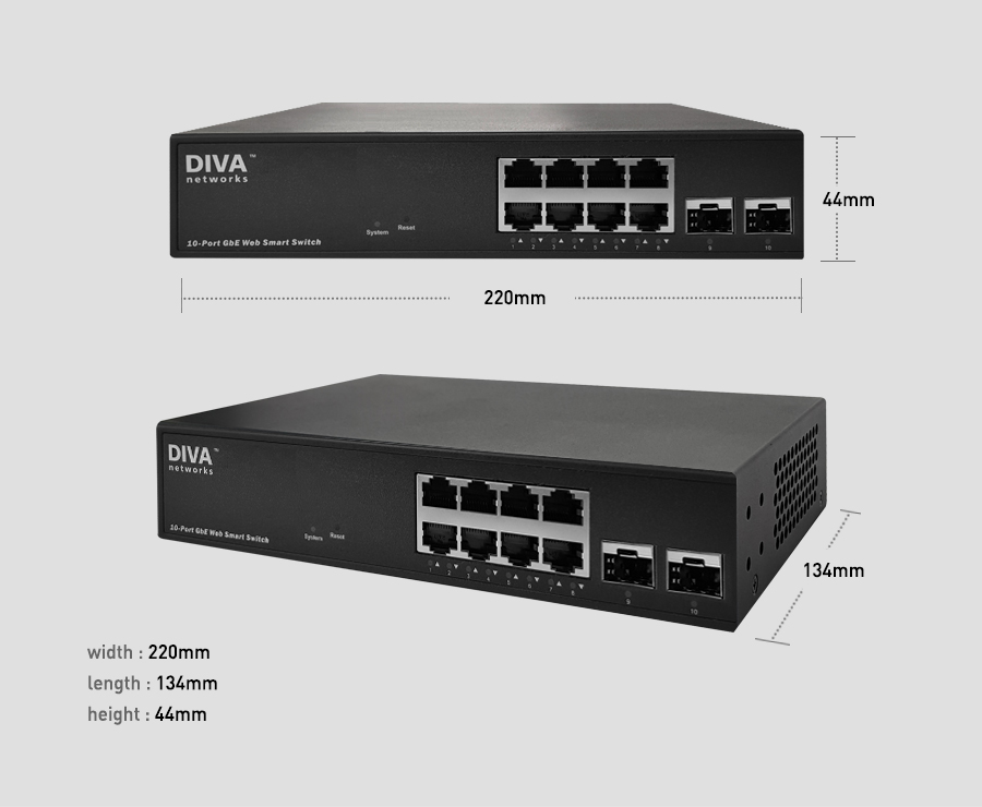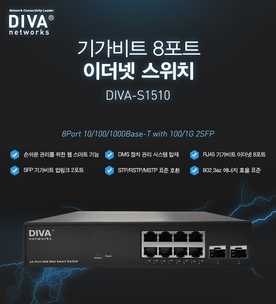 ● 802.3az 에너지 효율 표준● DIVA-S1510 모델은 웹 스마트 관리 기능을 지원하는 기가비트 이더넷 스위치 제품으로서 강력한 레이어-2 기능을 제공합니다.