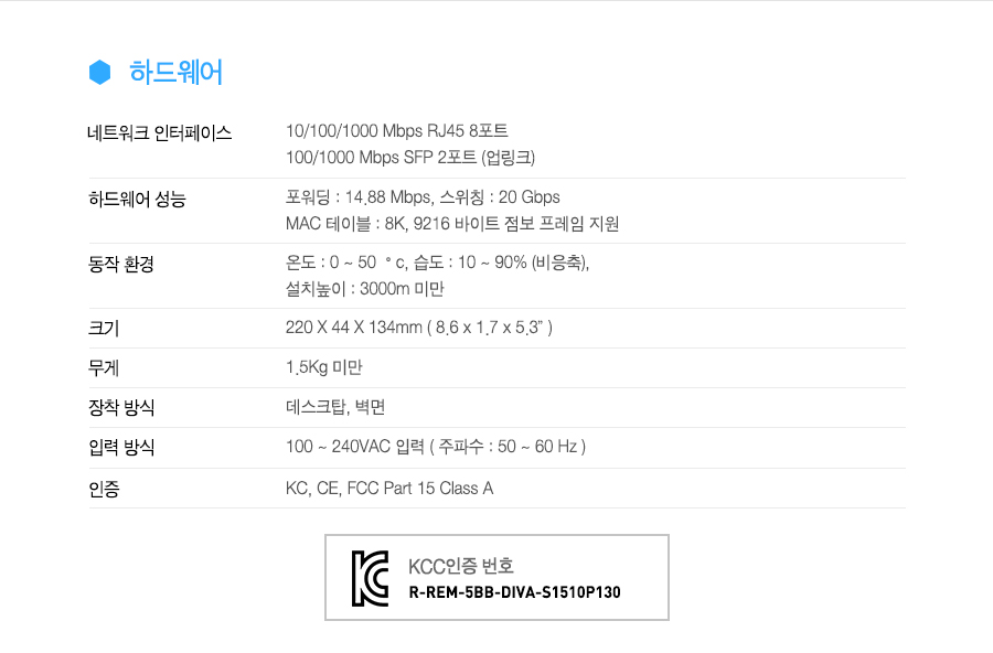 네트워크 인터페이스 | 10/100/1000 Mbps RJ45 8포트100/1000 Mbps SFP 2포트 (업링크) |