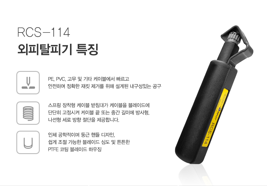 RCS-114(158) 라운드케이블스트리퍼는 직경4.5mm ~ 29mm의 옥외용 광 케이블 외피를 손쉽게 탈피할 수 있는 광케이블 탈피기 입니다.