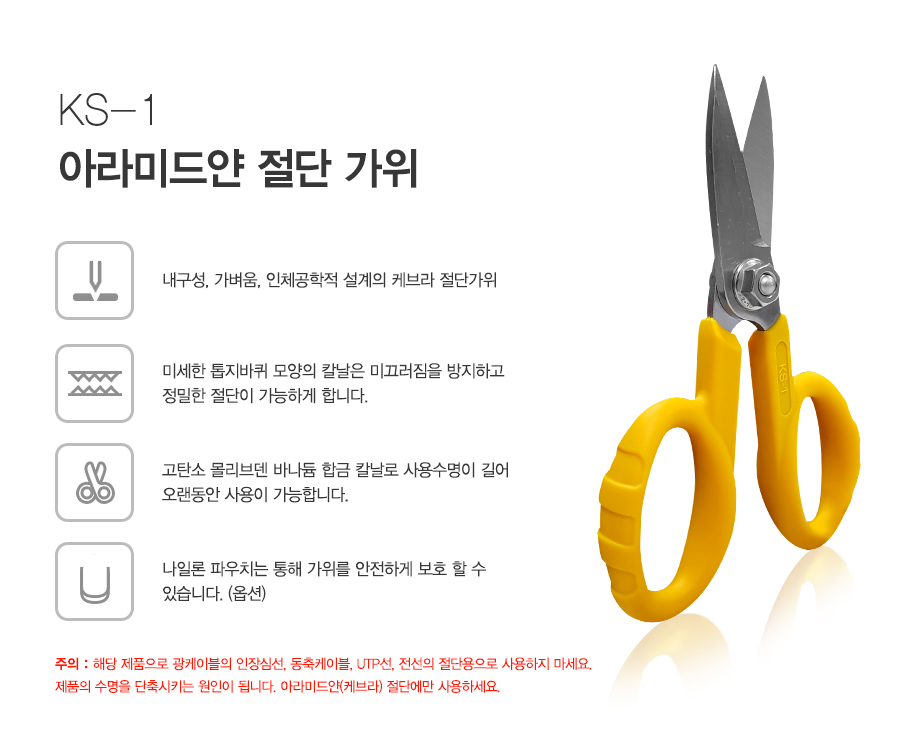 KS-1 가위는 아라미드얀 (캬브라) 전용 절단용 가위로 손쉽게 아라미드얀을 절단할수있어 작업 효율을 높일수 있습니다, 아라미드얀(케브라가위) 절단용 가위/광가위/광절단가위