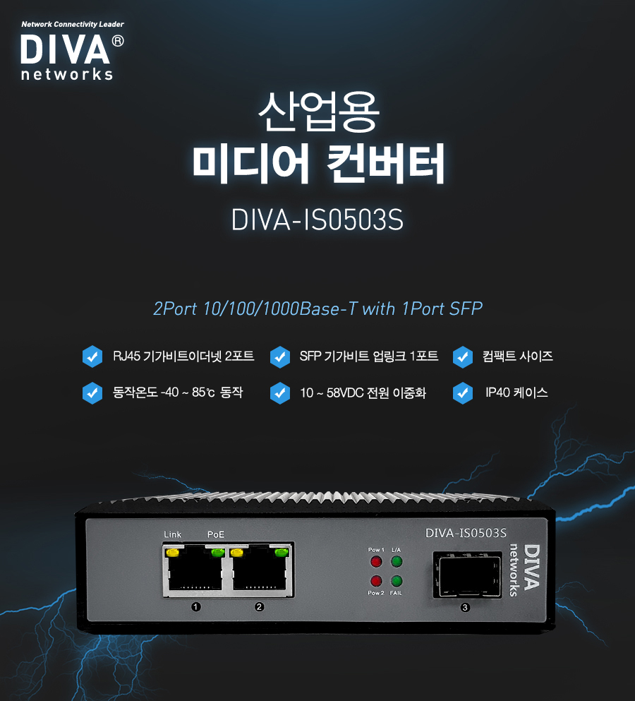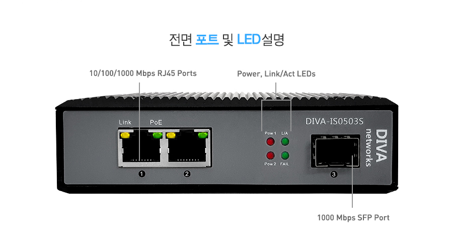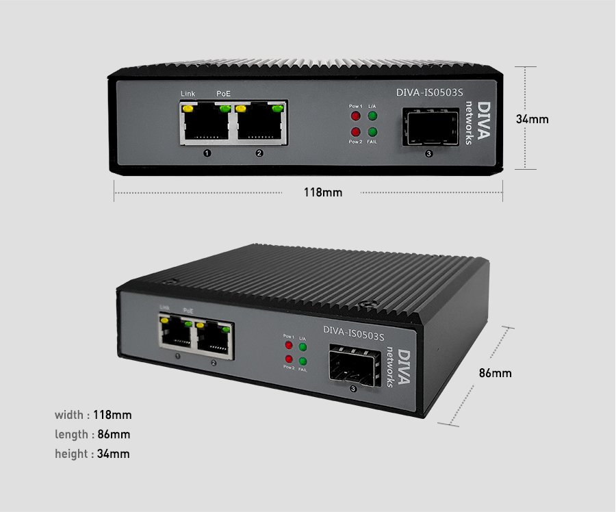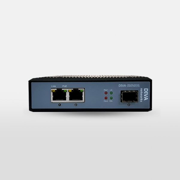 ● DIVA-IS0503S 모델은 비 관리형 이더넷 스위치 제품으로서 2개의 RJ45 포트와 1개의 SFP 포트를 통해 기가비트 고속 통신을 지원합니다.