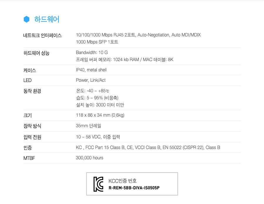 동작 환경 | 온도: -40 ~ +85℃습도: 5 ~ 95% (비응축)설치 높이: 3000 미터 미만 |