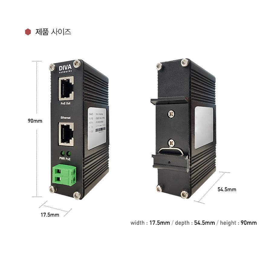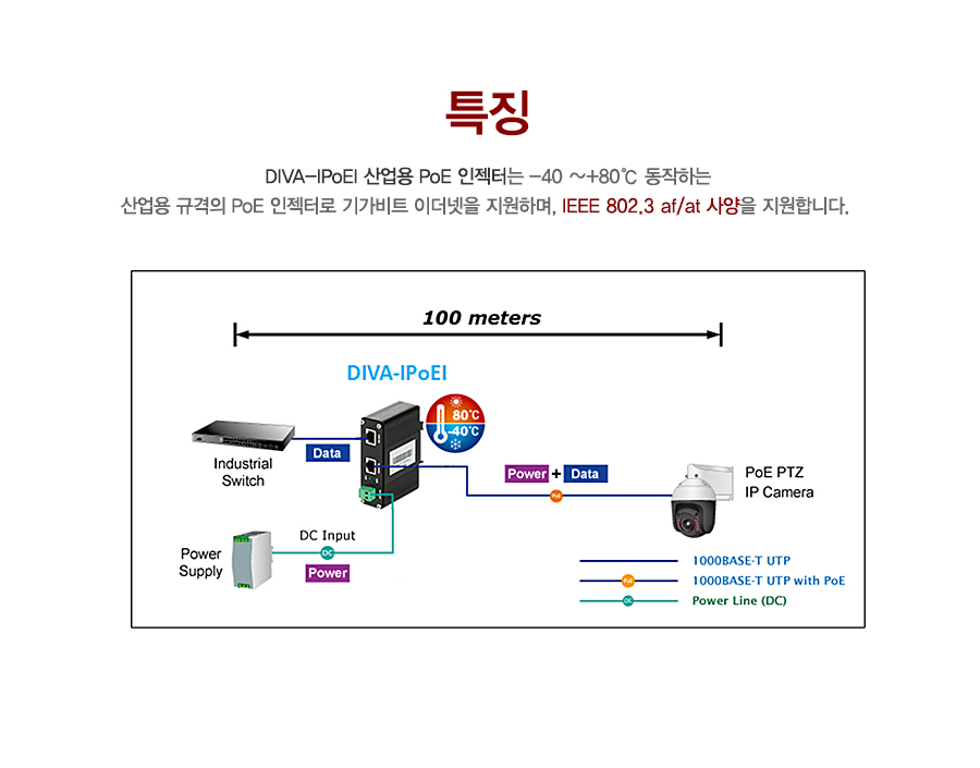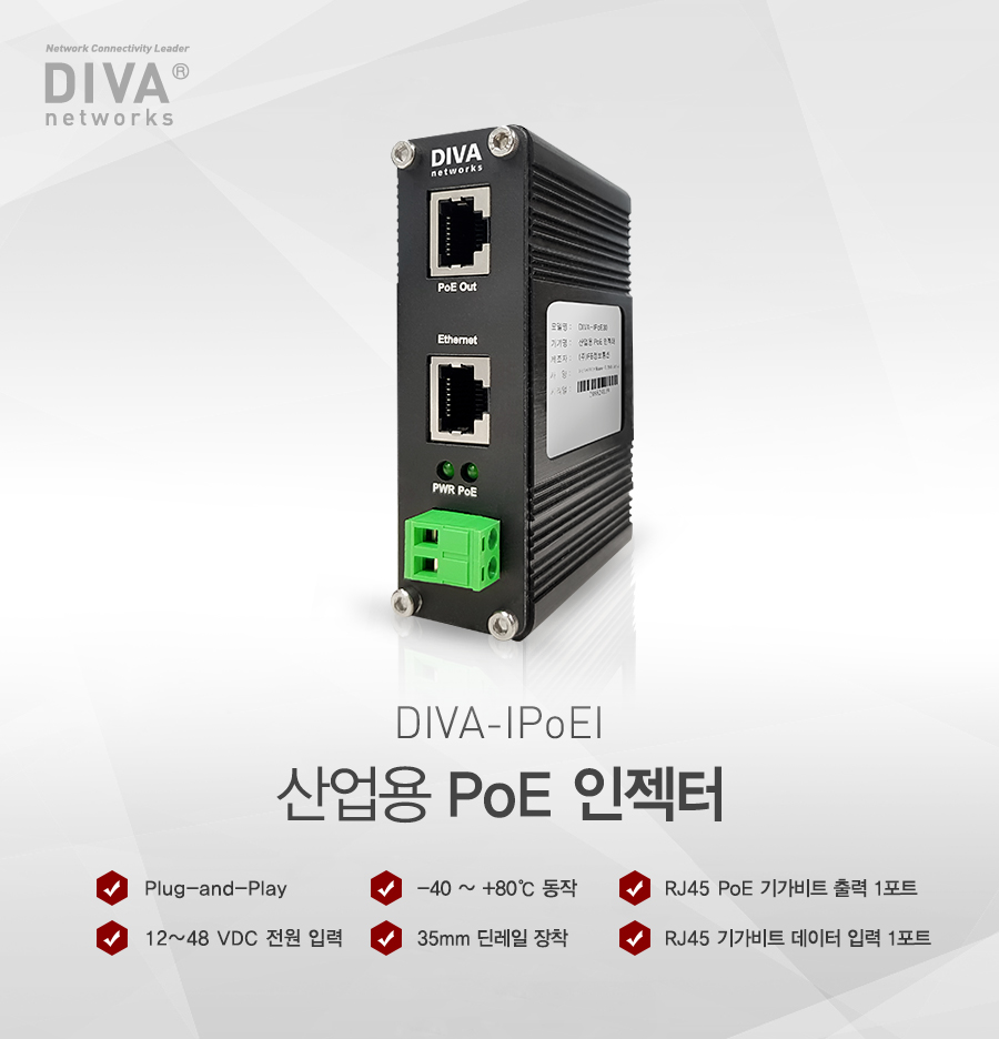 ● DIVA-IPoEI 산업용 PoE 인젝터는 -40 ~+80℃ 동작하는 산업용 규격의 PoE 인젝터로 기가비트 이더넷을 지원하며, IEEE 802.3 af/at 사양을 지원합니다.