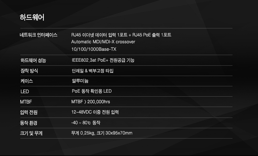 | 하드웨어 성능 | IEEE802.3at PoE+ 전원공급 기능 |