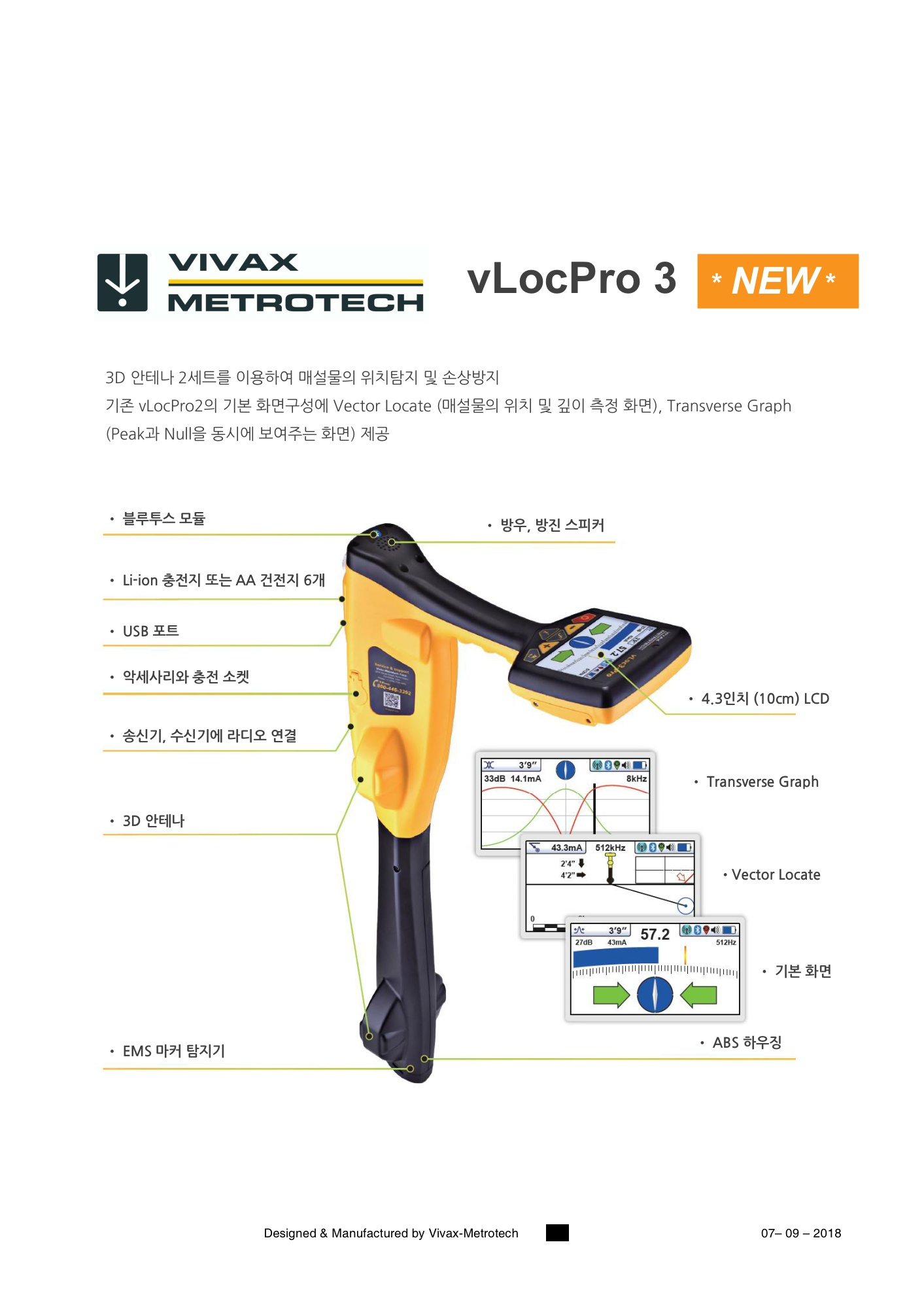기존 vLocPro의 기본 화면구성에 추가된 Vector Locate (매설물의 위치 및 깊이 측정 화면), Transverse Graph(Peak과 Null을 동시에 보여주는 화면)로 현장 분석이 더욱 용이해집니다.