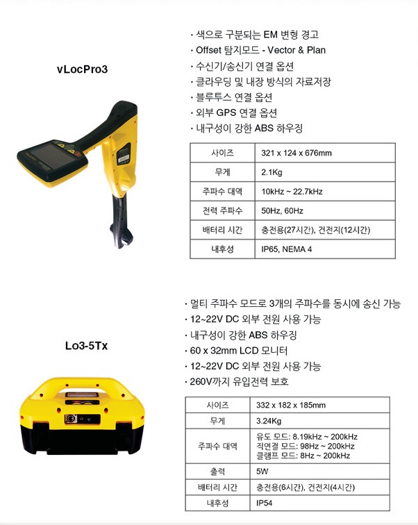 땅을 굴착하거나, 서비스의 중단 없이 지하에 매설되어 있거나 맨홀에 설치 되어있는 일반 전력선, 상수도관, 가스 공급관, 일반 전화 케이블 및 광섬유 케이블 등의 매설 위치, 매설 방향 및 매설 깊이를 측정하는 장비이다